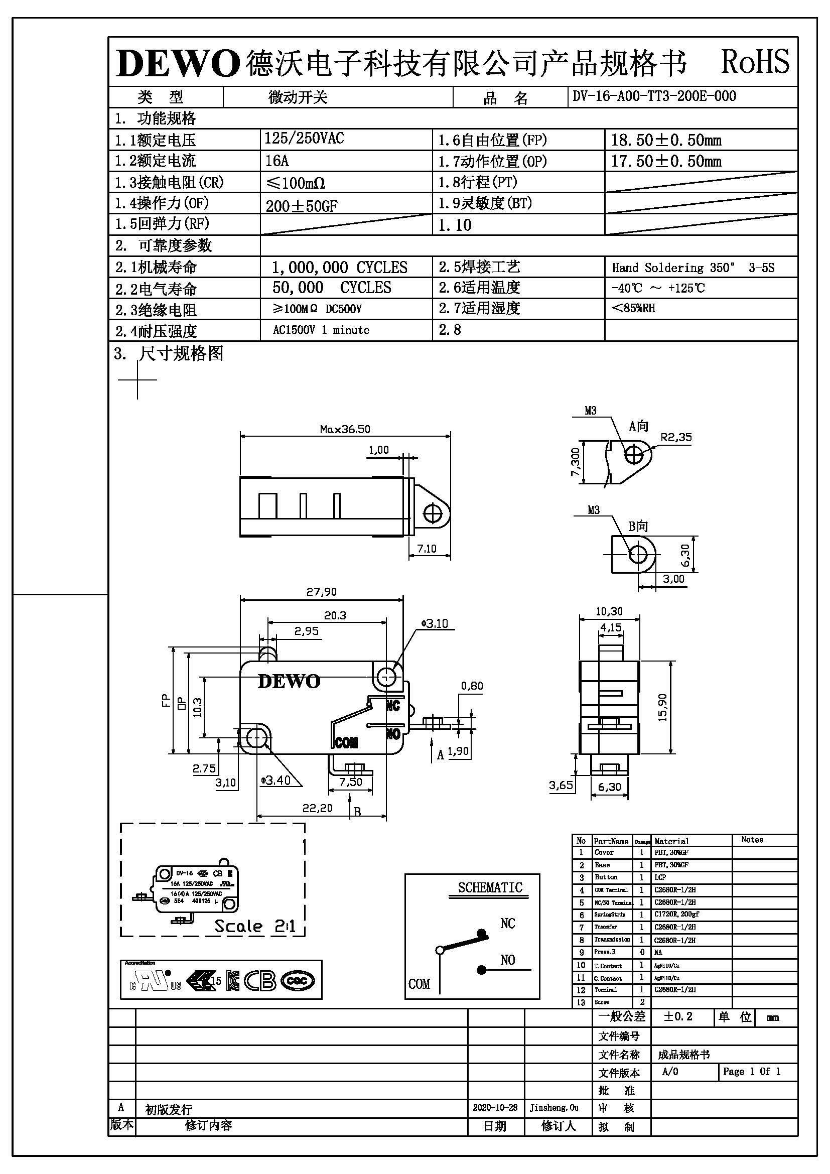DV-16-A00-TT3-200E型微動(dòng)開(kāi)關(guān)