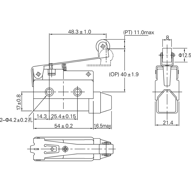 安裝孔間距為25.4mm,與RZ型微動開關(guān)相同。